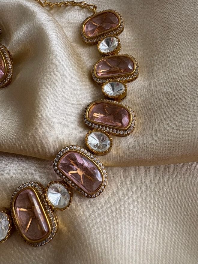 Elevate your look with this stunning necklace set, featuring light pink stones and sparkling polki accents for a striking contrast. The minimalist design offers versatility, making it perfect for both casual and formal occasions. An antique gold-tone chain adds warmth and elegance, beautifully complementing the stones. Matching earrings complete the ensemble with coordinated sophistication.