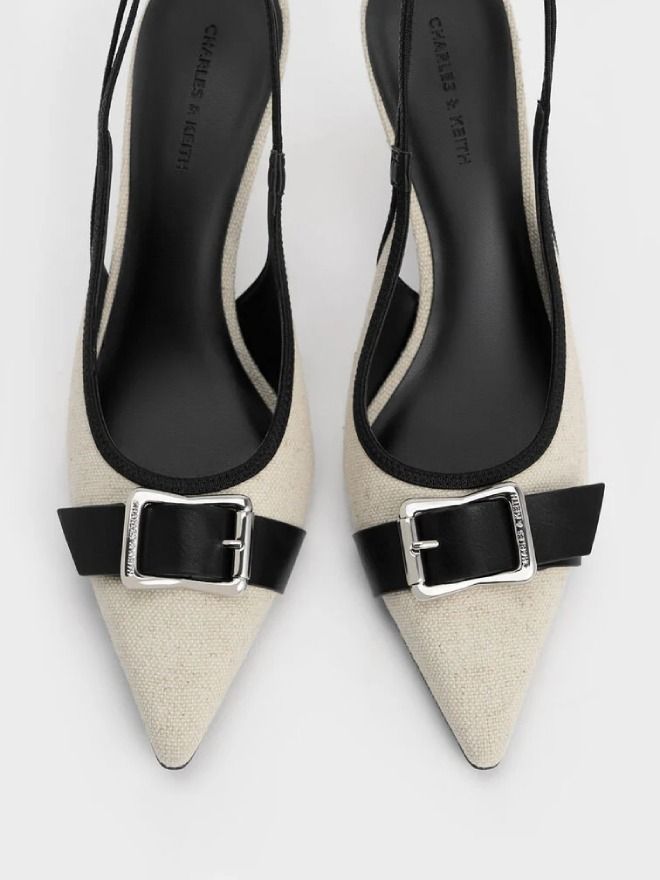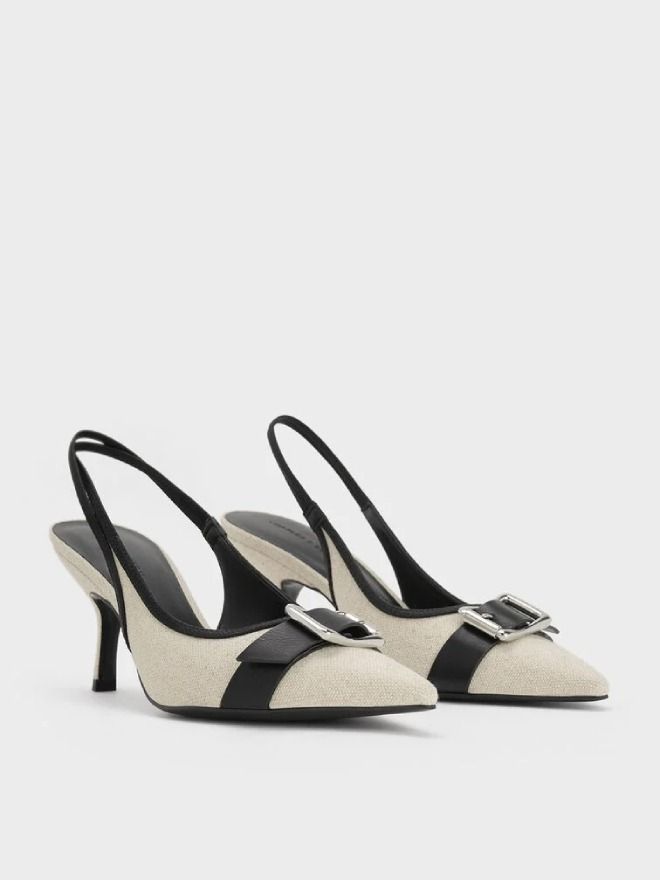 Achieve that effortlessly polished-yet-casual look with these slingback pumps. Featuring a two-tone colourway thanks to the tactile linen finish contrasted by black trims, these pumps are an easy way to elevate any outfit. To add a final touch, the metallic buckles bring an extra edge and visual interest to the design.