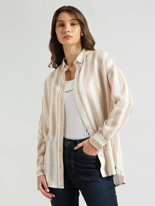 Breeze through the season in style with our effortlessly chic beige long sleeve shirt. Featuring a timeless stripe pattern, this shirt is crafted from a soft and breathable linen-viscose blend, offering all-day comfort in warm weather. The relaxed drop shoulder design and oversized fit bring a laid-back, modern edge to your look—perfect for beach days, brunches, or city strolls.