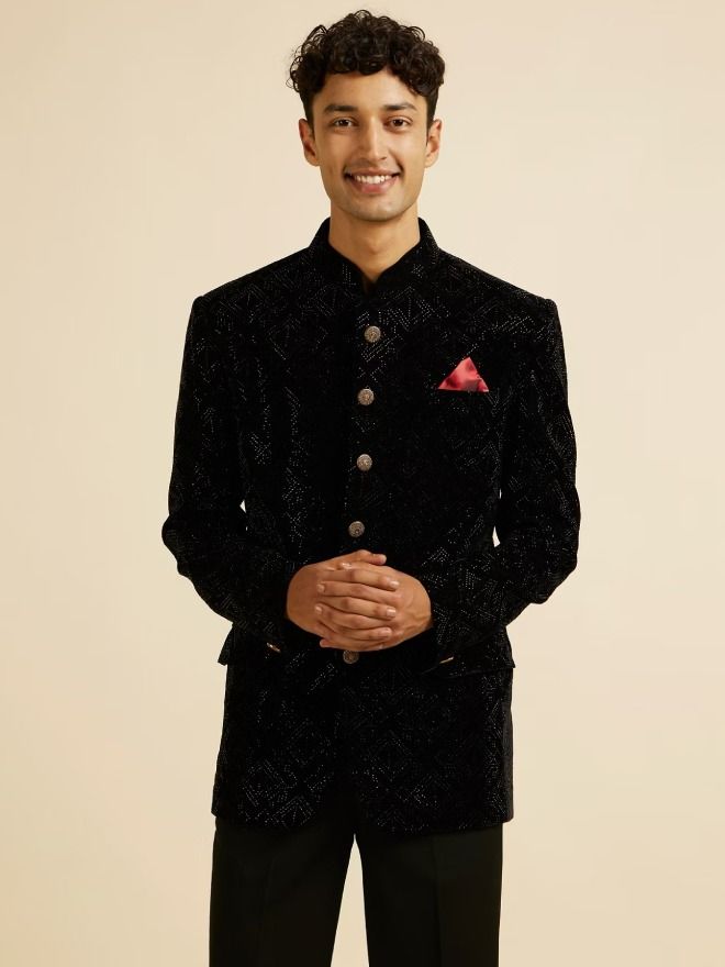 Showcasing exquisite rhinestone work in a diamond pattern, this black diamond patterned kurta set relays subtle luxury. The suit is further enhanced with an embroidered neckline, and golden buttons making it an ideal choice for formal occasions and celebrations where a sophisticated and dazzling appearance is desired. Style it with sleek gold jewellery and black sandals.