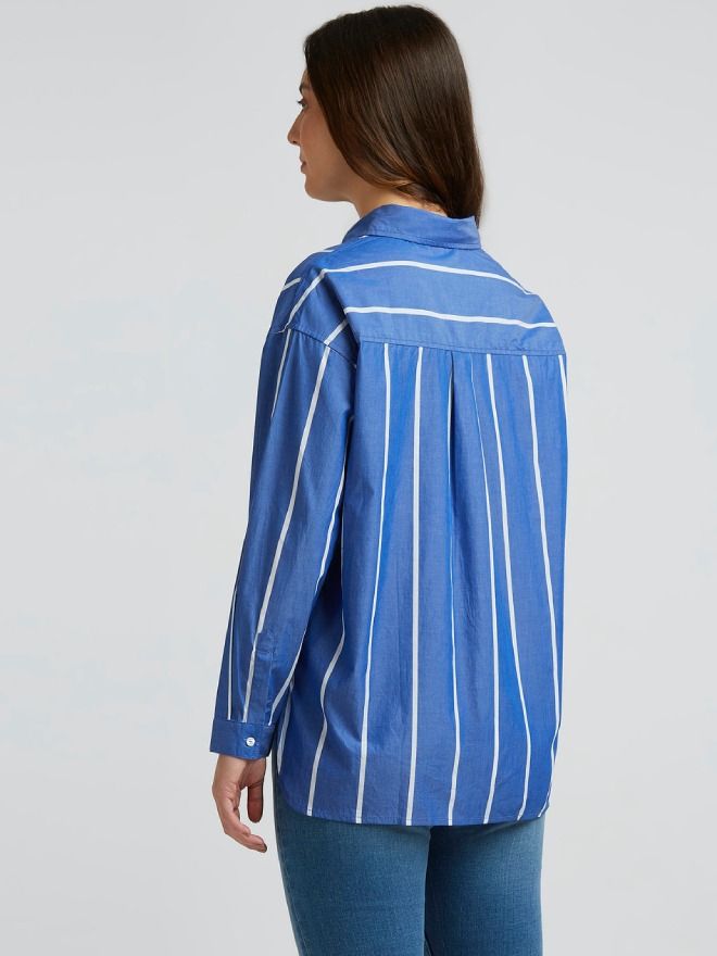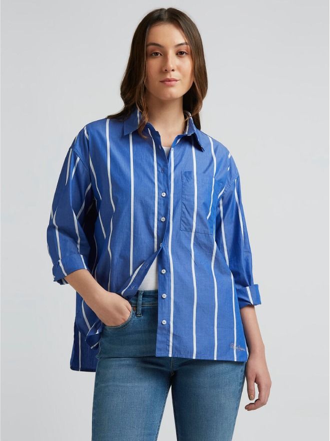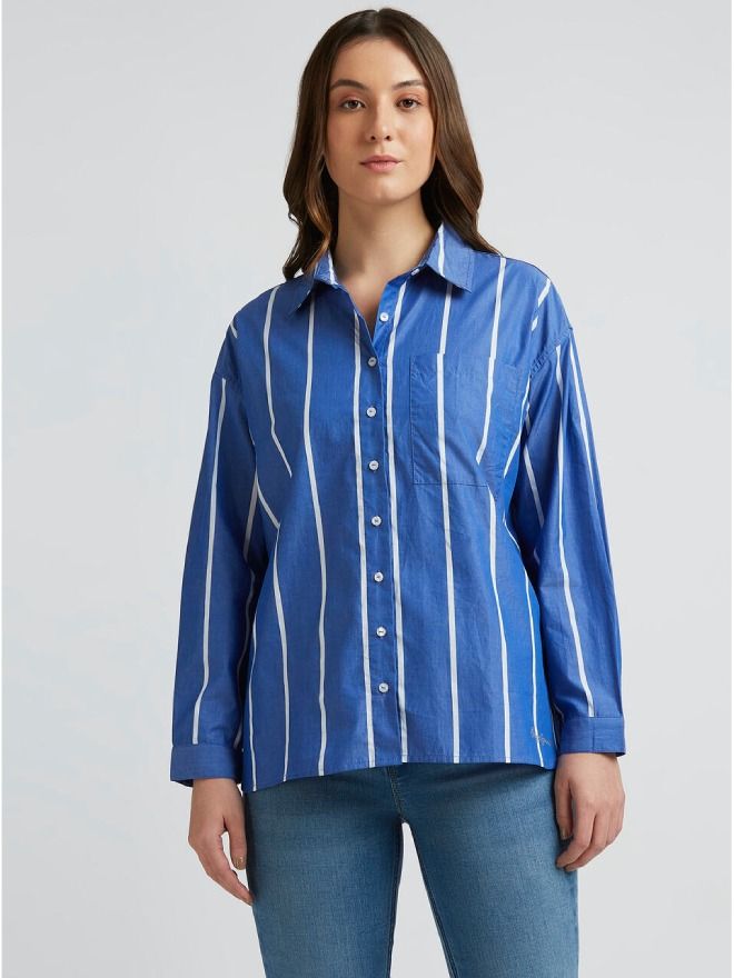 Refresh your wardrobe with this timeless and elegant blue striped shirt, designed for the modern woman who values both style and comfort. Made from breathable cotton and treated with a silicon softener wash, it delivers an ultra-soft, luxurious feel for all-day wear. The yarn-dyed stripes lend a classic yet eye-catching appeal, while rhinestone embellishments at the hem add a subtle touch of sparkle. Full sleeves make it ideal for year-round styling, and a functional patch pocket adds a hint of utility to its chic design.