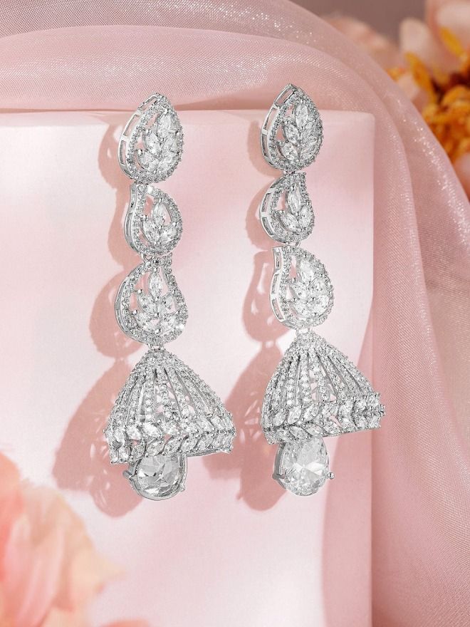 Earrings : These rhodium-plated statement earrings feature a dazzling array of cubic zirconia, designed in an elegant drop style, perfect for enhancing any look with sophistication and sparkle.