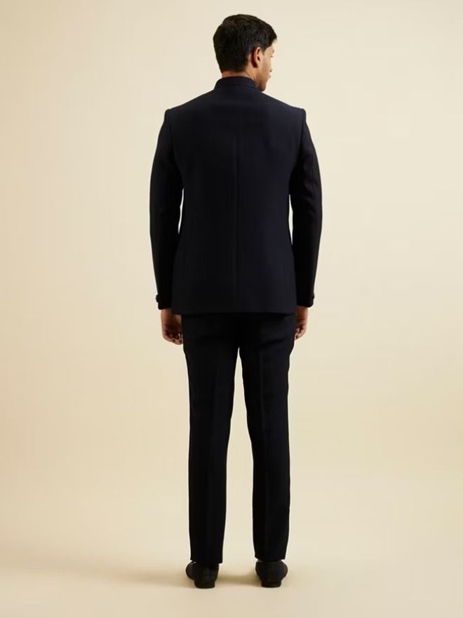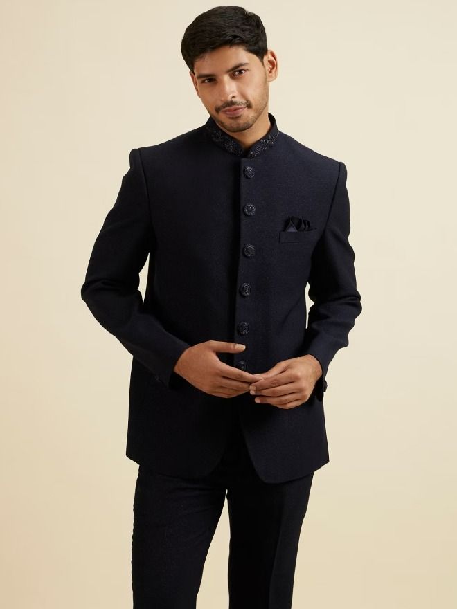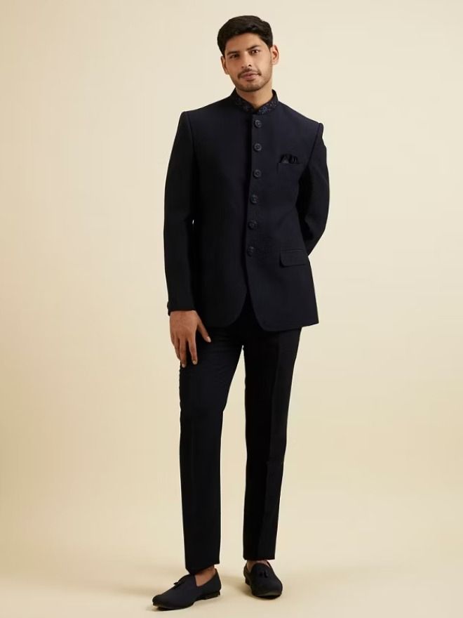 Exude regal sophistication with our Dark Blue Jodhpuri Set, designed for the modern man who appreciates heritage style. This distinguished ensemble features intricate embroidery along the neckline, adding a refined touch of opulence to its classic bandhgala silhouette.