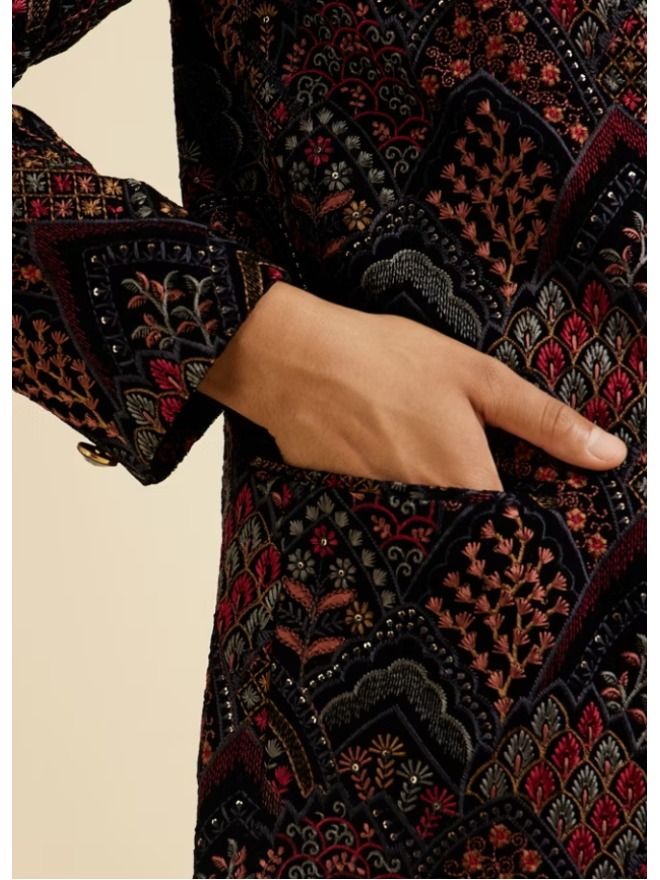Elevate your formal attire with our dark blue jodhpuri set for men, featuring elegant fern motifs in a unique fish scale pattern. Crafted from premium fabric, this set combines traditional craftsmanship with contemporary design, making it ideal for weddings and special occasions. The rich dark blue hue and intricate detailing offer a sophisticated and regal look. Pair this Jodhpuri set with black dress shoes and a coordinating pocket square for a polished and distinguished ensemble.man