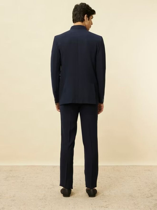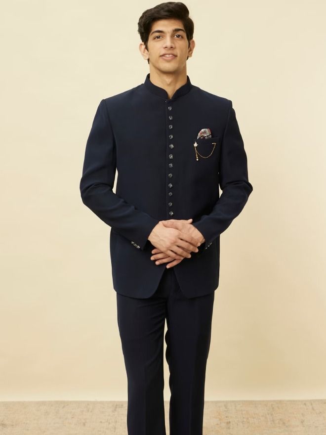 Elevate your formal wardrobe with our Dark Sapphire Blue Jodhpuri Suit, a seamless fusion of timeless Indian tradition and modern sophistication. This impeccably tailored ensemble features a classic bandhgala collar, regal emblem buttons, twin flap pockets, and a welted chest pocket—offering both style and functionality.