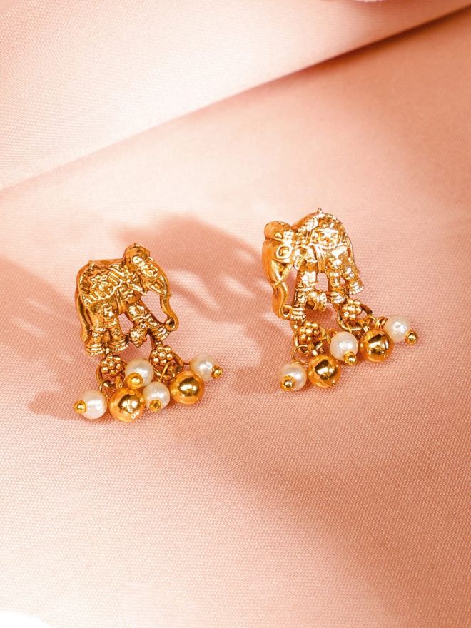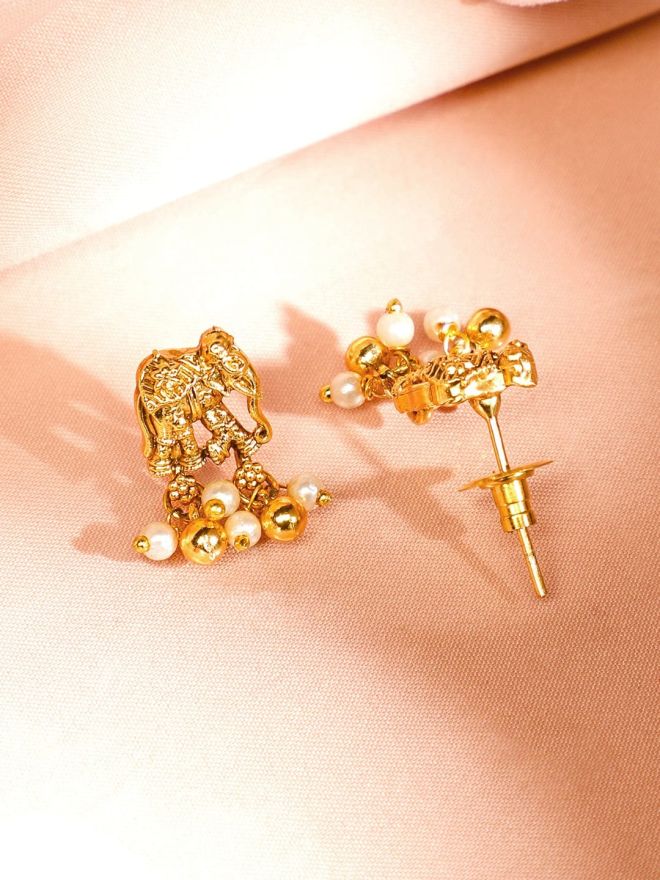 Jewellery Set : This 22K gold-plated temple necklace set features a divine ganesh motif, ruby and emerald stone accents, and pearl beaded drops with earrings—perfect for women & girls for festive and wedding looks.