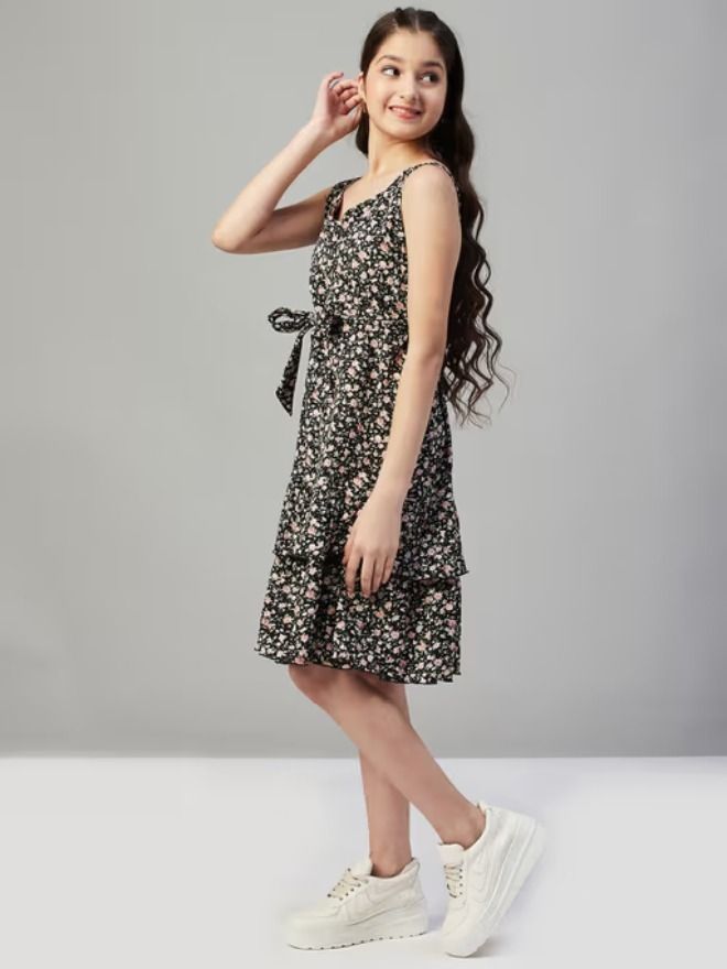 Let her step out in style with this beautiful black printed knee-length A-line dress—perfect for casual outings and everyday charm.