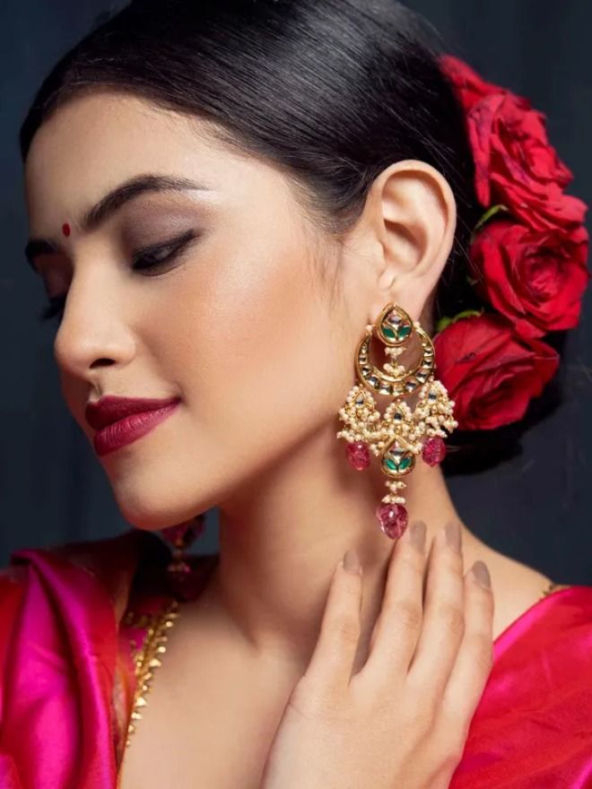 Green & Pink Stone Kundan Chandbali Earrings