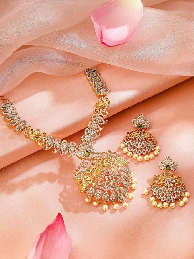 Adorn yourself with the Rubans 24K Gold-Plated Jewelry Set, featuring intricate ruby, emerald, and cubic zirconia embellishments paired with delicate pearl accents for a timeless traditional appeal.