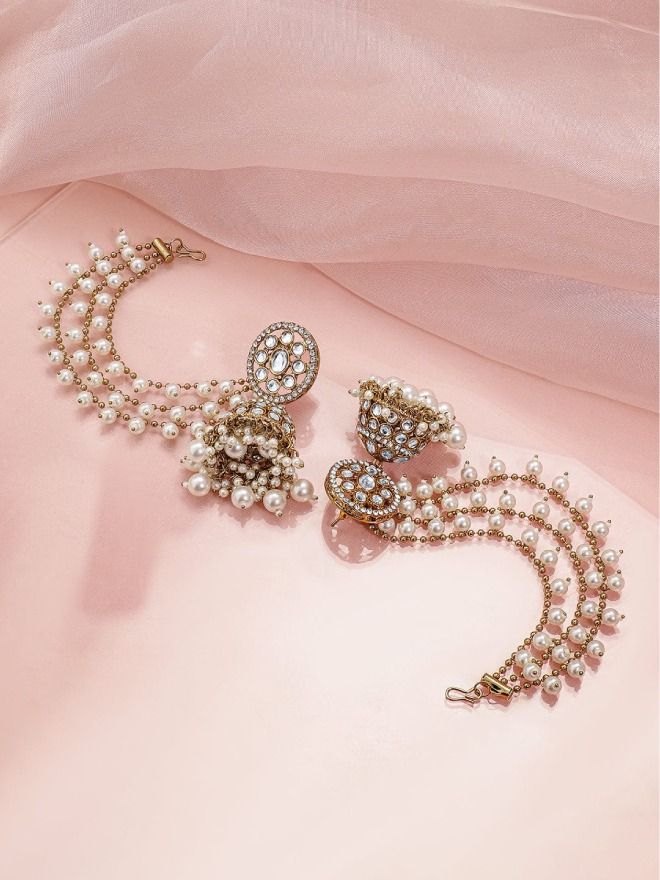 Elegant 18K gold-plated kan chain jhumka earrings adorned with kundan and zirconia details, paired with cascading white pearl beads, offering a luxurious and traditional appeal.