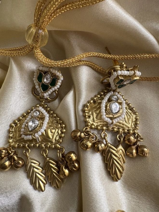 This striking fusion jewelry set showcases a harmonious blend of traditional artistry and contemporary design. The choker necklace takes center stage with a central rectangular plaque intricately detailed with a deep teal or green gemstone surrounded by delicate white accents and a border of smaller green stones. This central motif is further embellished with textured gold work and tiny pearl-like beads along its edges.