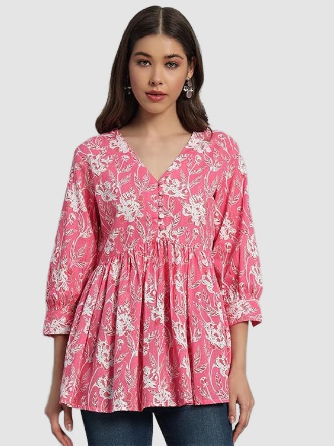 • Model: Cotton Printed V-Neck Flared Top with 3/4th Sleeves (Pink_Extra Large)