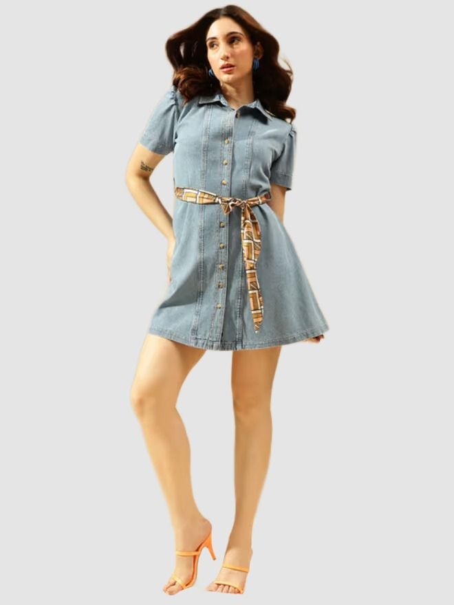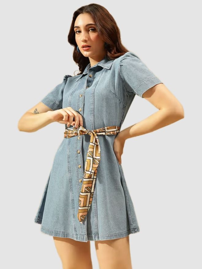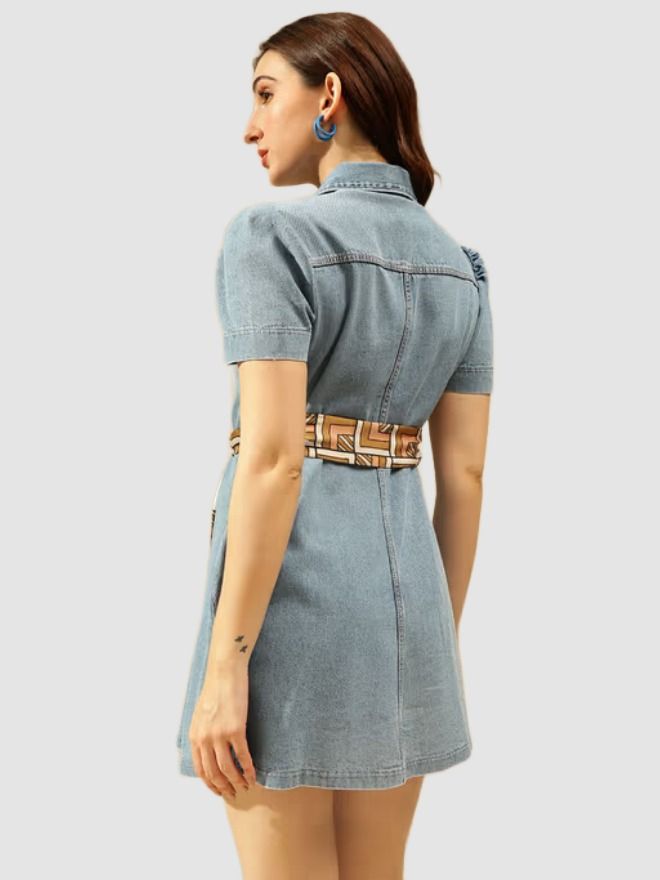 Light Blue Woven Denim Shirt Dress, Has A Shirt Collar, Short Sleeves, Button Closures