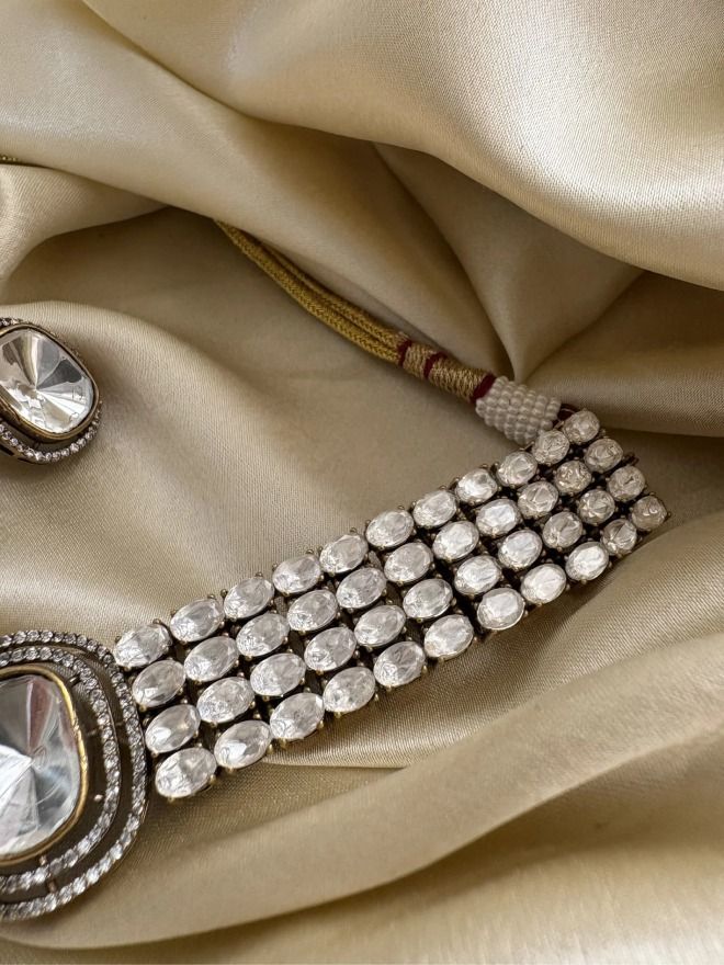 The Luxe Polki Choker Set is truly captivating, featuring a blend of Victorian-inspired metalwork, shimmering moissanite polkis and diamonds that exude timeless luxury. This exquisite set is the ideal choice for festive celebrations and weddings, effortlessly combining elegance with a touch of regal sophistication. The matching stud earrings beautifully complement the choker, enhancing the set’s overall charm. It’s a statement piece that elevates any traditional ensemble with grace and grandeur