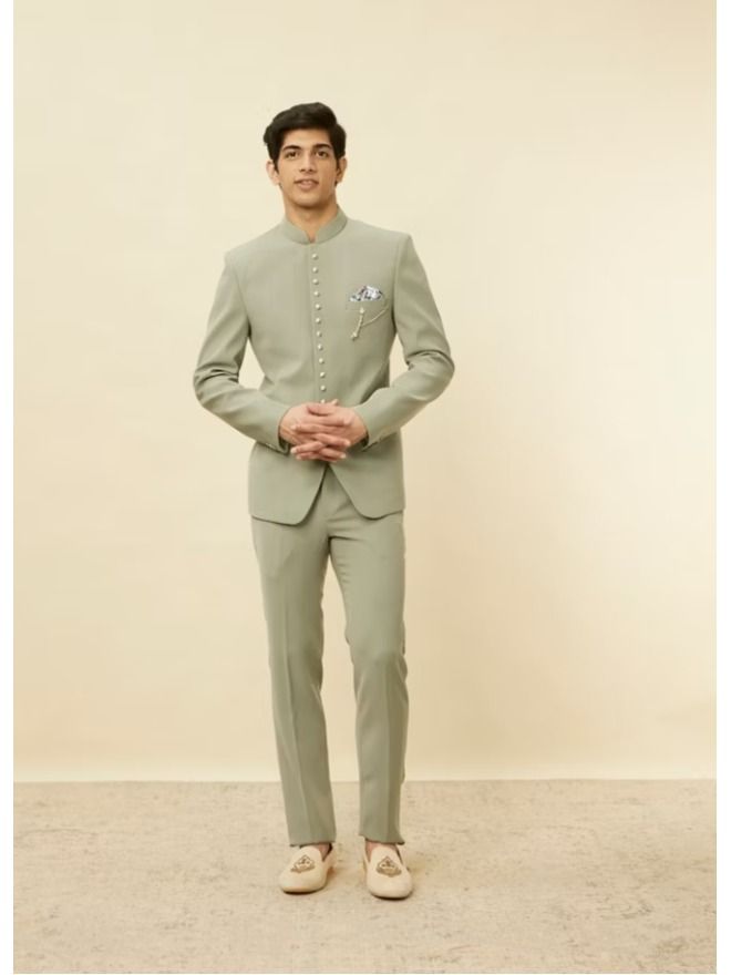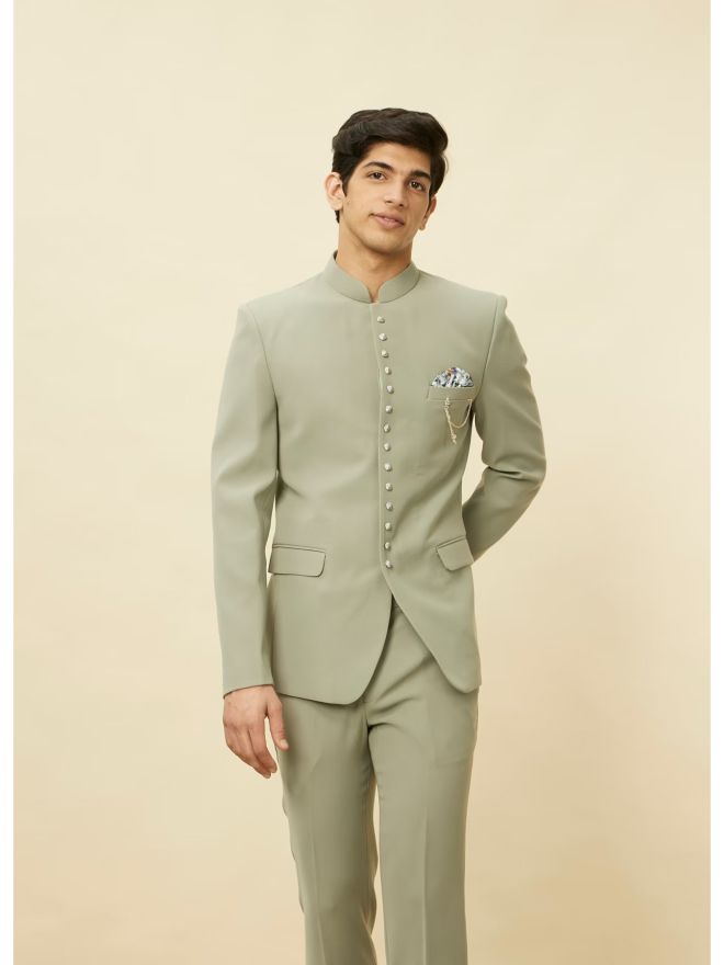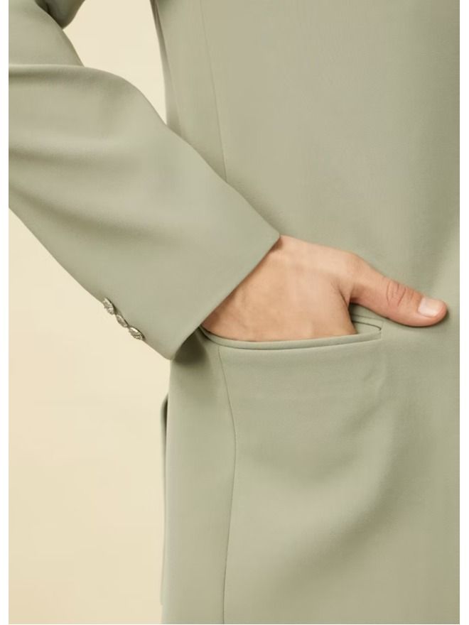 Green solid regular-fit blazer, has a notched lapel, single-breasted with double button closures, long sleeves, one welt pocket, and two flap pockets, and a double-vented back hem