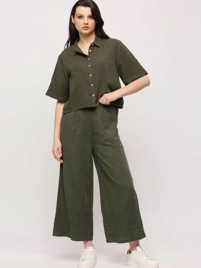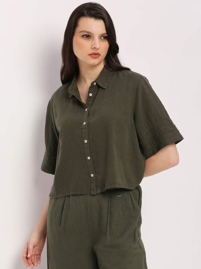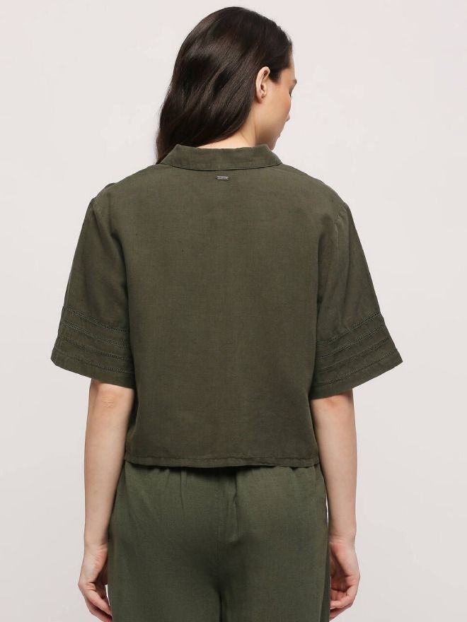 Refresh your warm-weather wardrobe with our women’s olive-hued solid woven shirt, designed for effortless elegance and everyday ease. Crafted from a premium blend of breathable linen and soft cotton, this shirt is your go-to for staying cool and stylish. Delicate lace accents on the short sleeves lend a feminine flair, while the buttoned-up front adds a touch of sophistication. The comfort cropped fit creates a flattering silhouette that pairs perfectly with high-waisted trousers, skirts, or denim.
