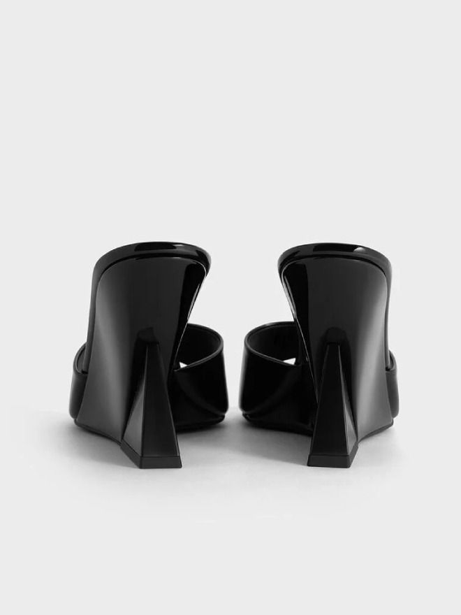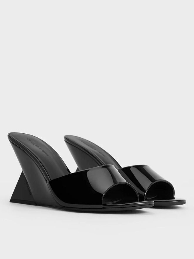 Elevate your everyday look with ease in these chic black patent wedge mules. Designed with comfort and style in mind, their effortless slip-on design makes them perfect for on-the-go moments. Featuring a timeless peep-toe silhouette and glossy patent finish, this pair brings a polished touch to any outfit. The 9cm wedge heels offer a flattering lift, while the unique triangular detail adds a modern twist to the classic wedge shape.