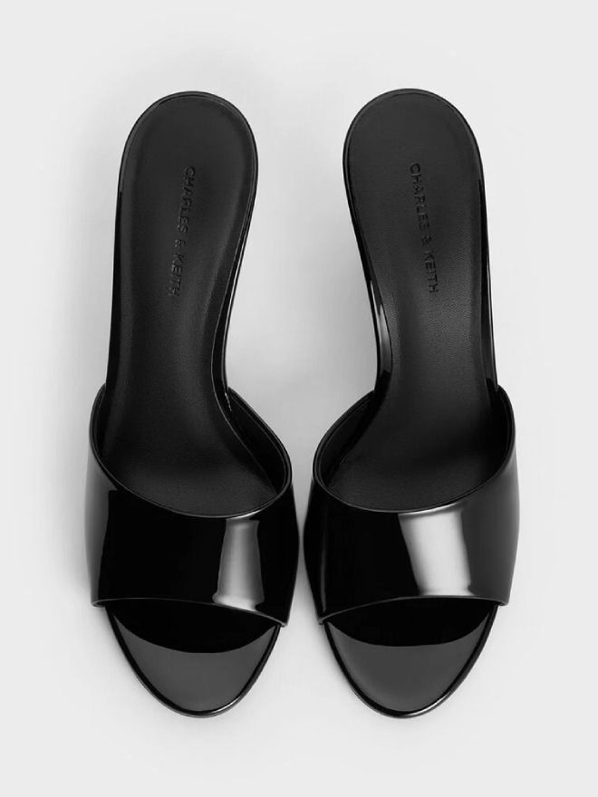 Sleek Elevation – Black Patent Wedge Mules with Peep-Toe