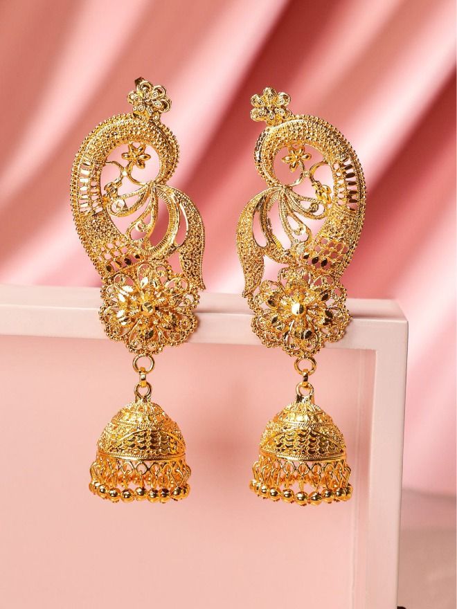 Exquisitely handcrafted 18K gold-plated jhumka earrings, featuring a full ear-covering peacock filigree motif, adorned with floral detailing and ornate dome-shaped jhumkas. Perfect for weddings, festive occasions & traditional celebrations.