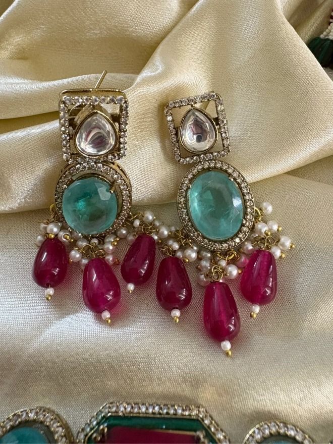 This set features a beautifully designed choker necklace and matching earrings, perfect for adding a touch of regal elegance to your bridal or festive attire. The necklace showcases a captivating arrangement of intricate AD work, with each piece adorned with meticulously set in American diamond, renowned for their detailed craftsmanship and timeless appeal. The set features striking semi-precious stones in a captivating blend of deep ruby red and serene turquoise blue, creating a mesmerizing contrast. Delicate pearl drops and strands enhance the overall design, adding a touch of sophistication and grace.