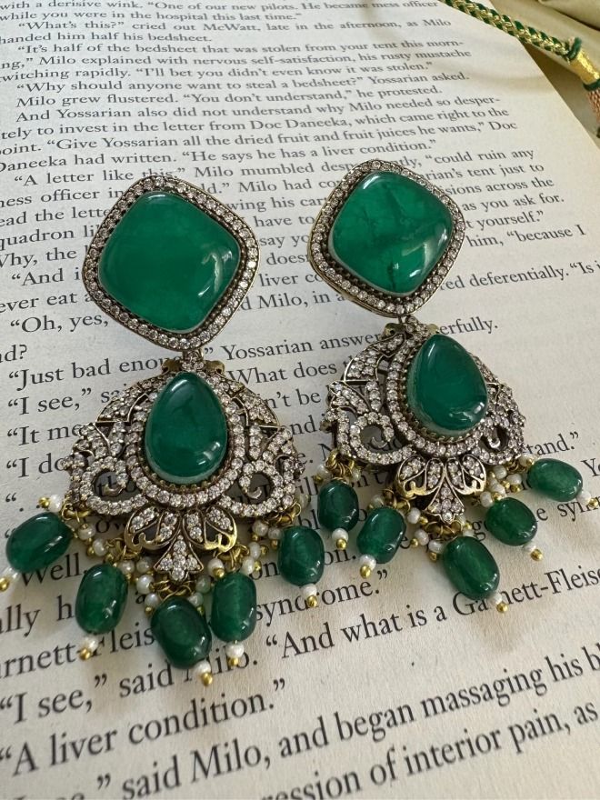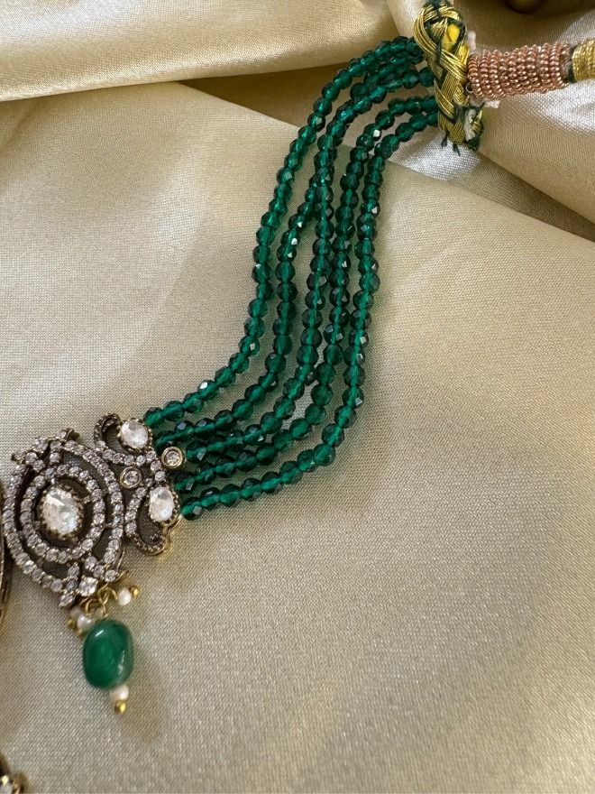 This exquisite set exudes vintage charm and sophisticated glamour, perfect for special occasions. The choker features multiple strands of emerald green onyx beads, adding rich texture and a vibrant pop of color. Intricately designed pendants with large semi-precious stones create a captivating focal point, enhanced by delicately set polki and AD stones for a subtle shimmer. The antique Victorian polish on the metalwork lends a timeless allure, while matching earrings complete the ensemble with coordinated elegance.