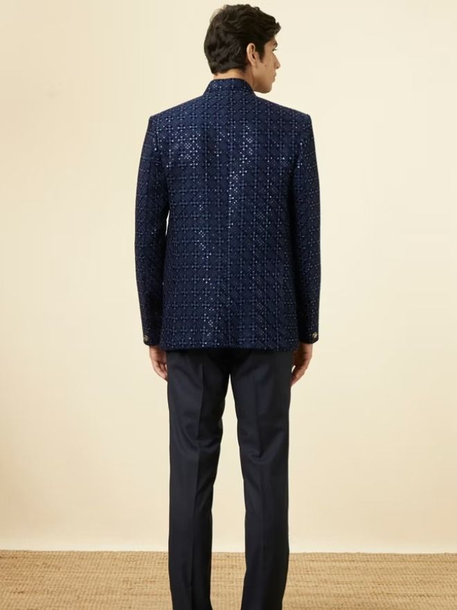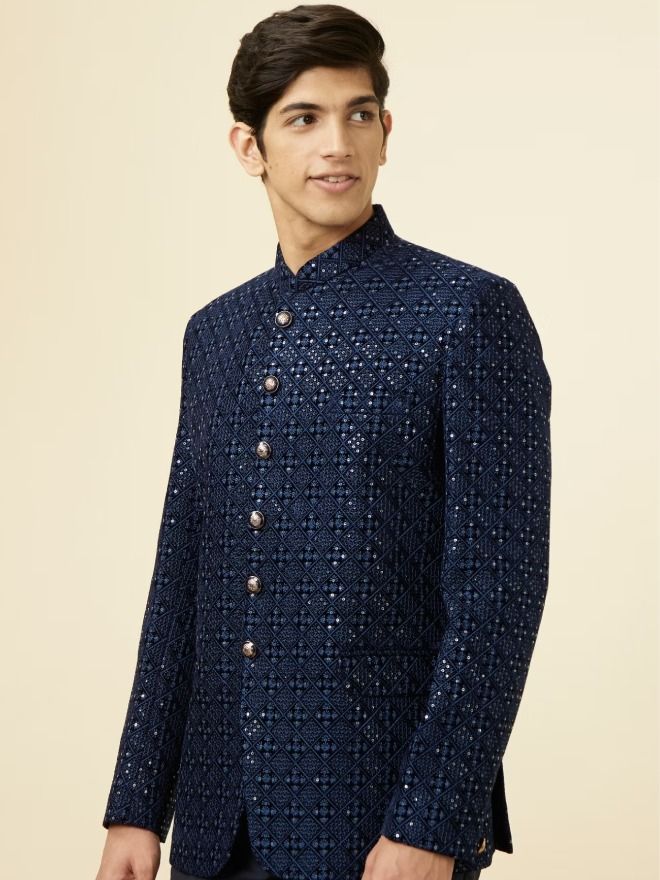 Featuring floral motifs within grid patterns, beautifully embroidered and adorned with sequins, this royal blue suit is a showstopper. The suit's Jodhpuri style, accented with filigree buttons, makes it ideal for upscale events. Pair with sleek silver jewellery and shiny dress shoes for a glamorous ensemble.