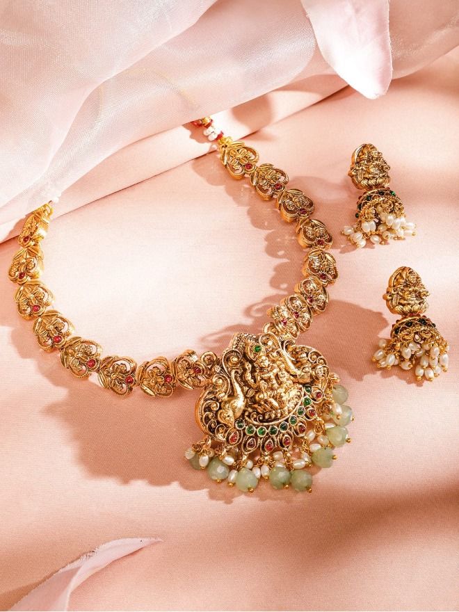 Jewellery Set : This 22K gold-plated temple necklace set features a divine Lakshmi motif, ruby and emerald stones, mint green and white beaded drops, and matching earrings—ideal for women & girls for festive and wedding looks.