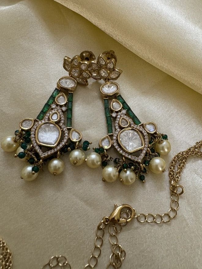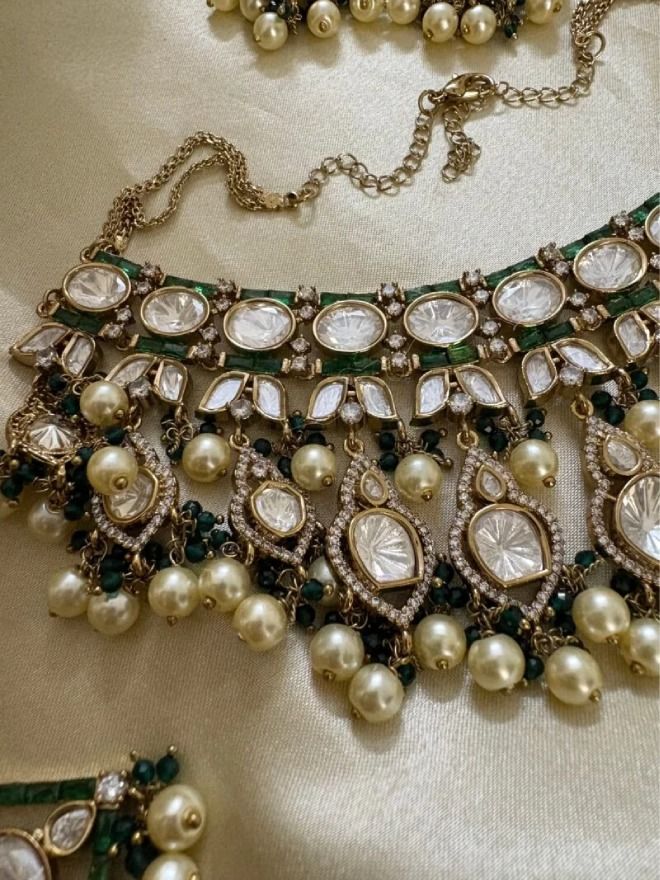 The Timeless Sparkle Polki Choker exudes timeless elegance, blending intricate craftsmanship with luxurious design, perfect for weddings. Adorned with moissniate polki stones, green stone work, and CZ diamonds, it is both stunning and versatile.