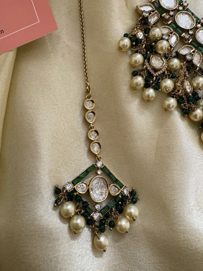 Featuring a chic choker, elegant earrings, and a mangtikka, it complements traditional and modern bridal looks. Pair it with a long polki necklace for a layered effect. This set is ideal for brides seeking a standout piece that radiates charm and sophistication.