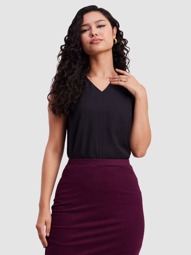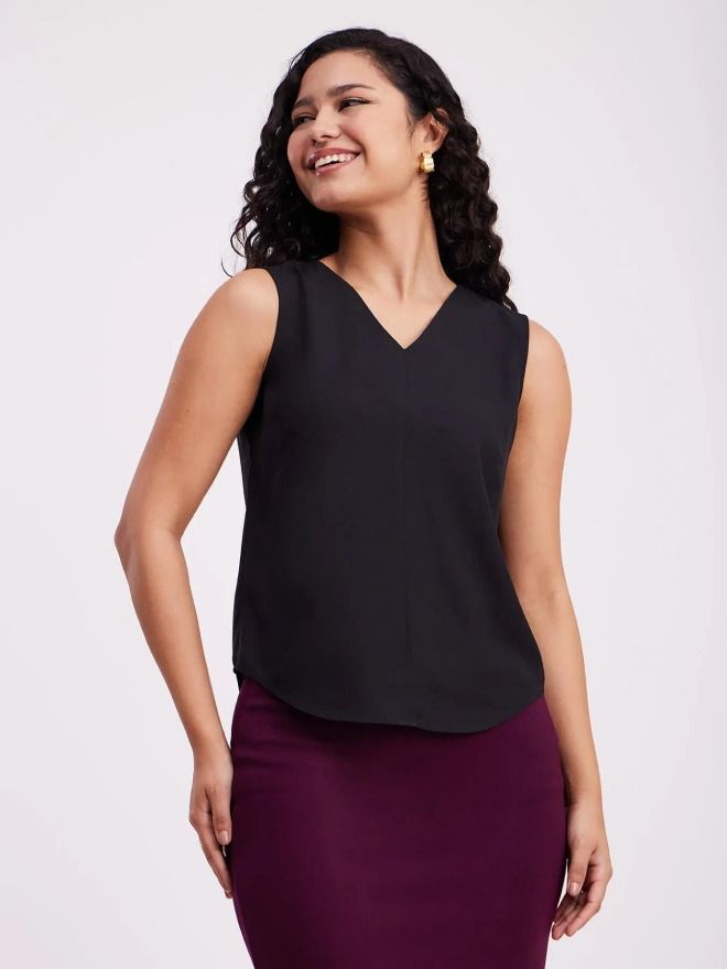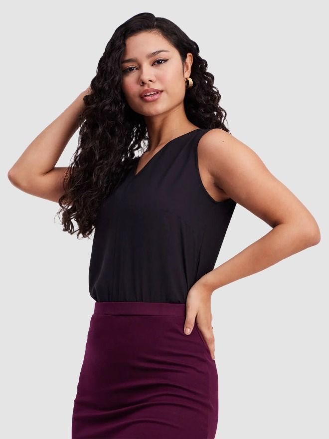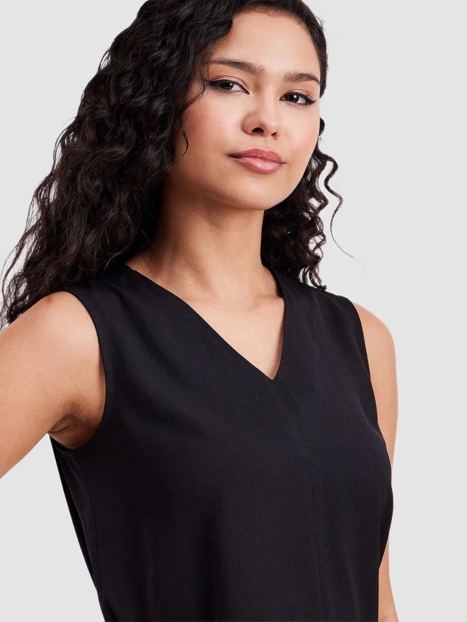 This black sleeveless top has a V-neck. Made from Polyester Summercool, it is soft and comfortable to wear.