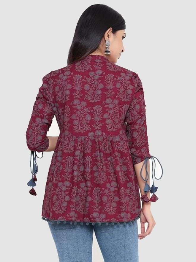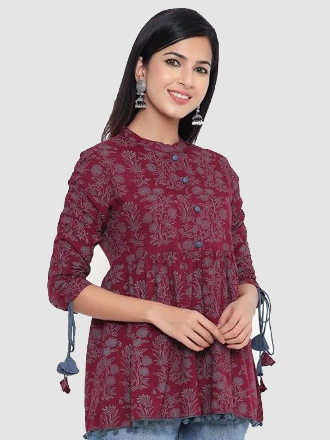 • Fabric: Rayon || Product Length : TOP 28 Inches|| In Box : 1 TOP; Style Pattern: Printed and Flared || Neckline : Mandarin Collar || Sleeves: 3/4 Sleeves.