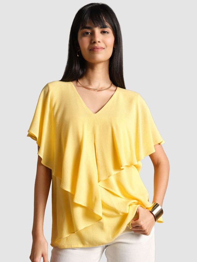 Add a playful flair to your casual look with ruffles! In a yellow hue that adds a vibrant touch, this top is crafted in a flowy fabric, that feels soft against the skin & offers ease of movement.
