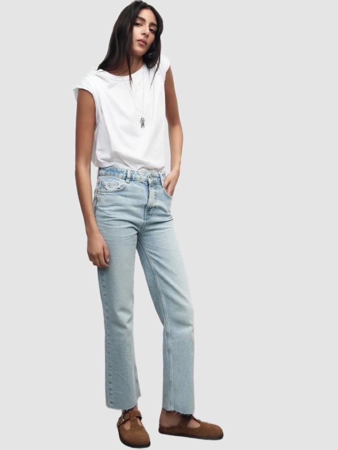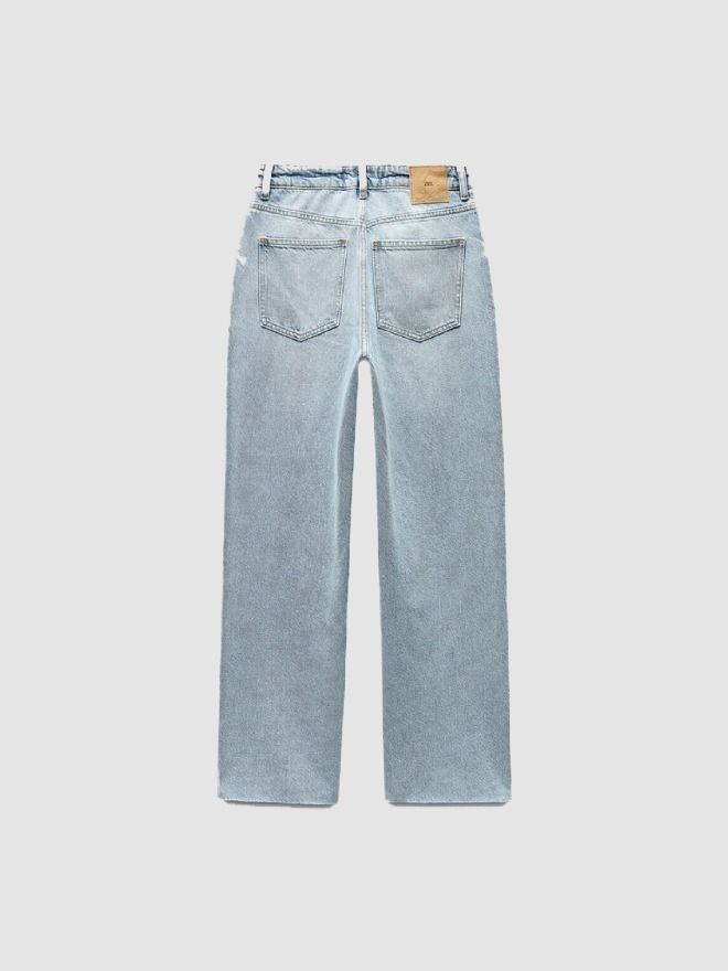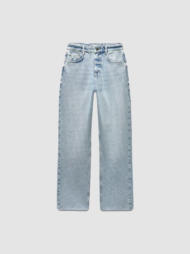 High-waist ankle-length jeans with five pockets. Straight leg with a raw hem. Zip fly and metal button fastening.