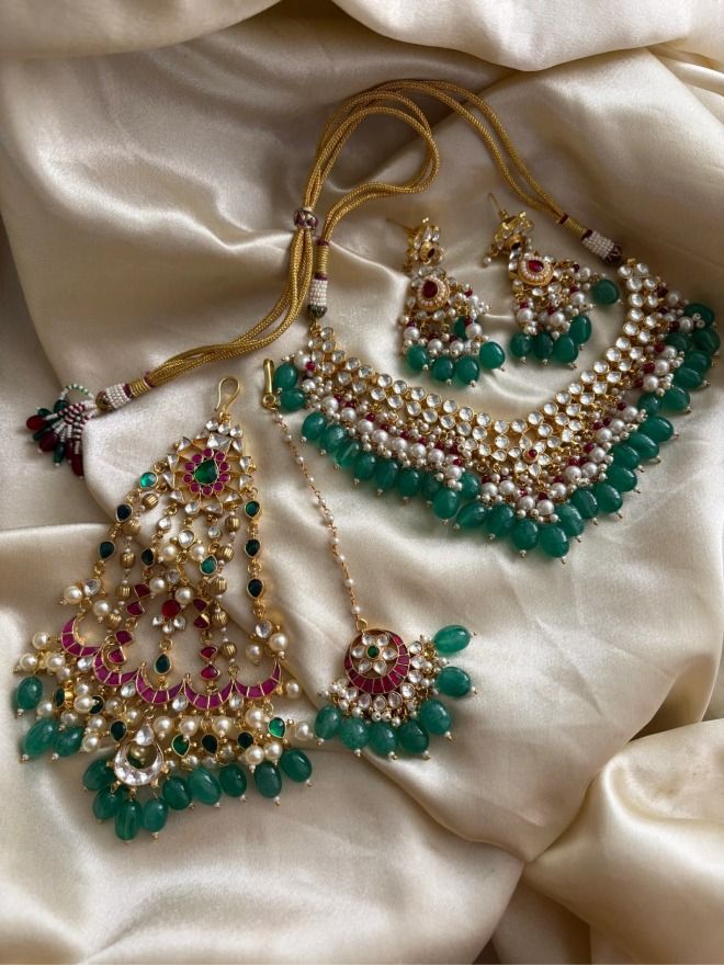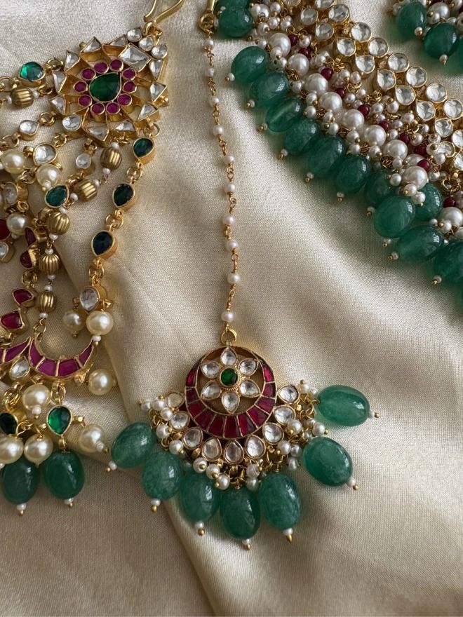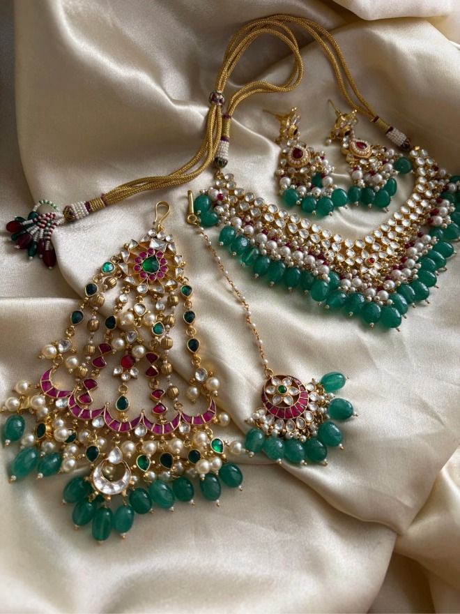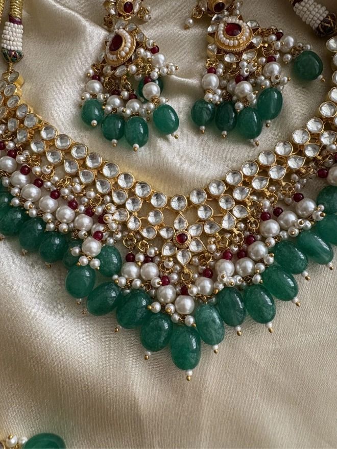 This heritage minimal bridal kundan necklace set is a captivating traditional Indian jewelry piece, expertly handcrafted with lustrous micron gold plating. Featuring an enchanting blend of pink and green hues, accented with emerald green beads and delicate clusters of pearls, it brings a refined elegance to any ensemble. The flexible design molds seamlessly to the wearer’s neck. The set includes a pair of earrings, a perfectly small sized maangtikka, and a matching passa, creating a complete and exquisite bridal look.