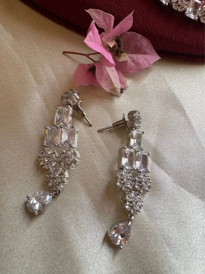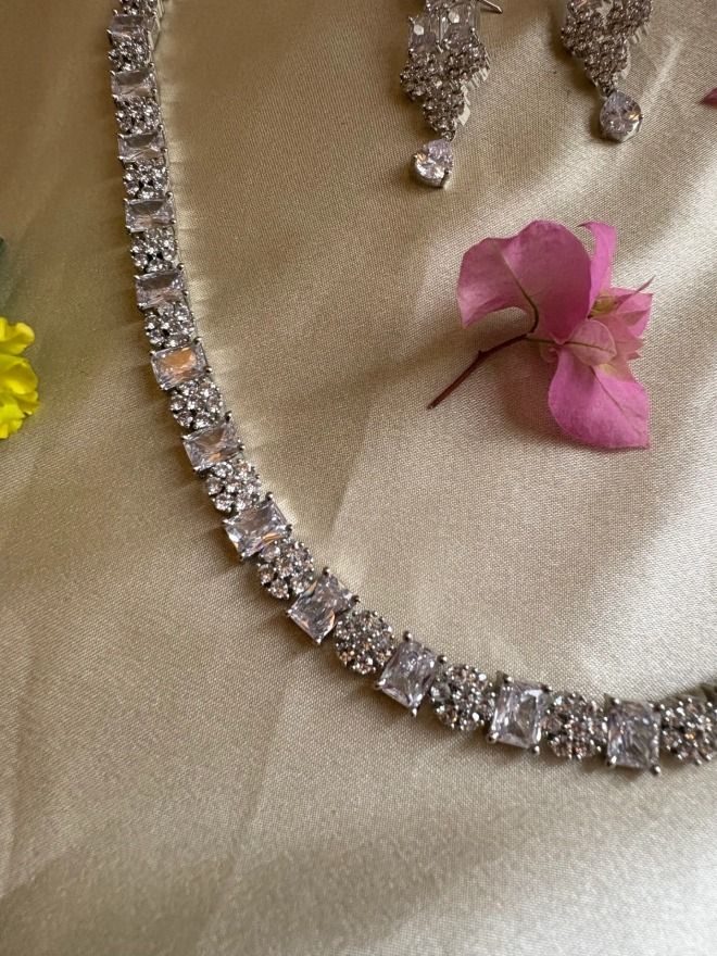 This exquisite single-line American Diamond necklace set is a stunning fusion of timeless elegance and modern flair. Its distinctive design, with its graceful necklace style, not only accentuates the wearer’s neckline but also ensures it stands out as a statement piece in any jewelry collection. More than just an accessory, it serves as a captivating statement that complements both formal and casual outfits, making it an essential addition to any jewelry wardrobe.