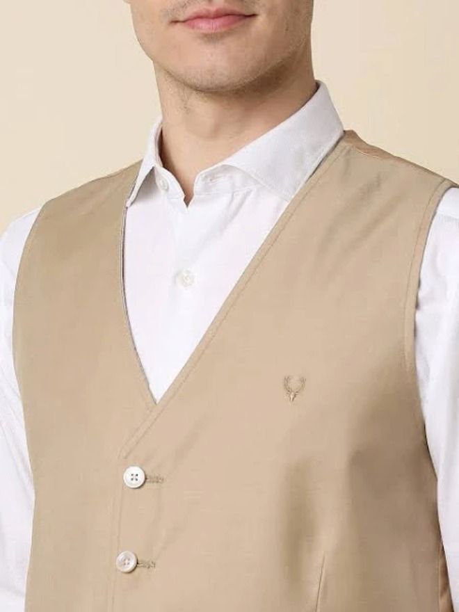 Brown solid slim-fit waistcoat, has a v- neck, single-breasted with double button closures, long sleeves, and two flap pockets, and a back hem