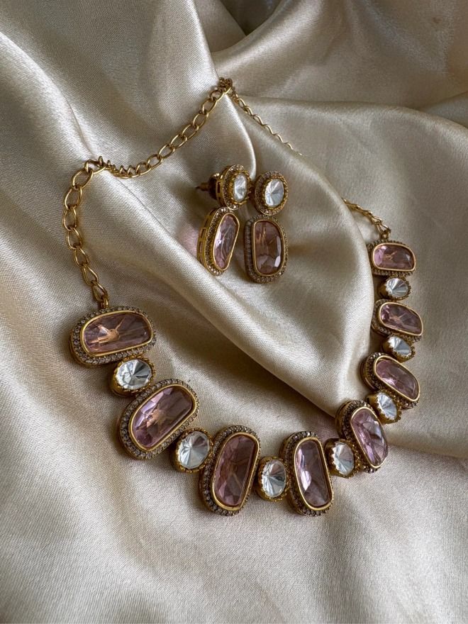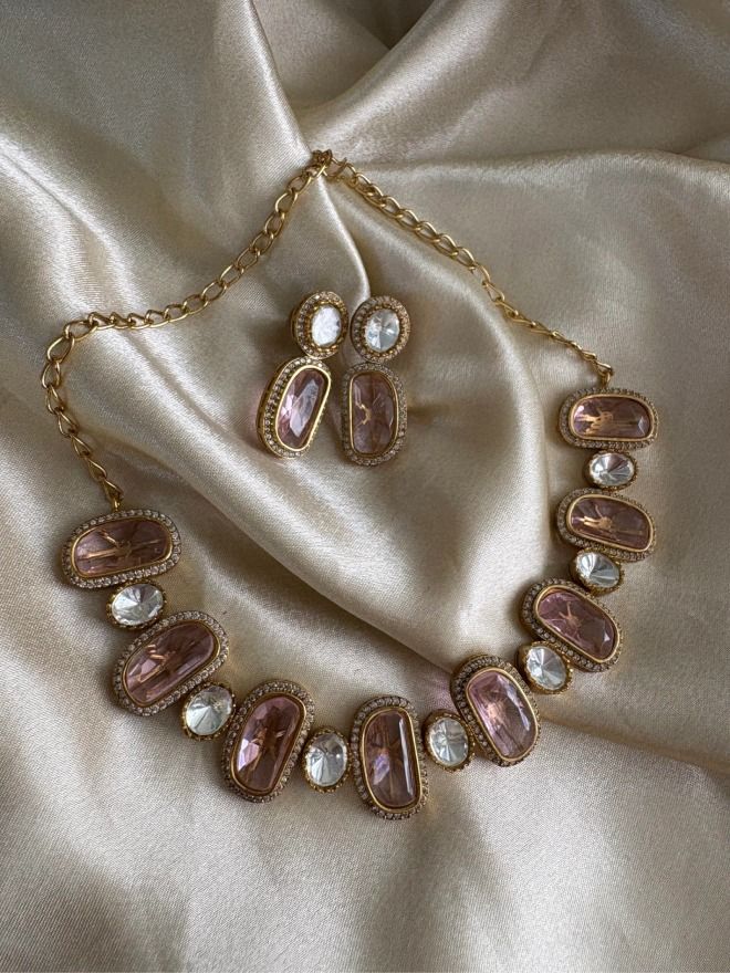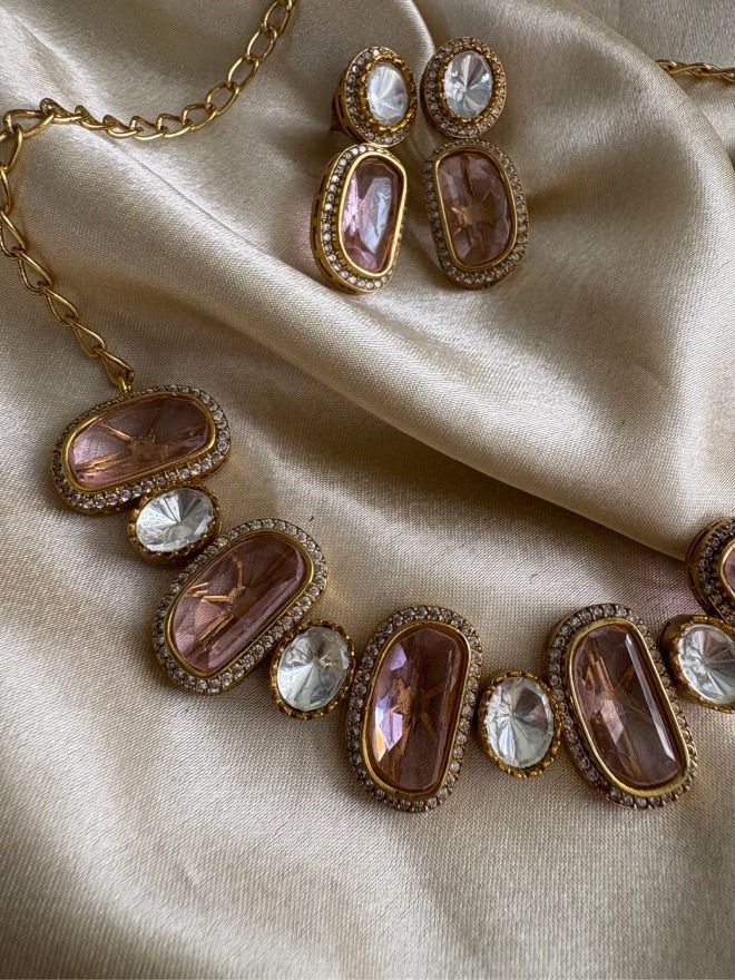 Elevate your look with this stunning necklace set, featuring light pink stones and sparkling polki accents for a striking contrast. The minimalist design offers versatility, making it perfect for both casual and formal occasions. An antique gold-tone chain adds warmth and elegance, beautifully complementing the stones. Matching earrings complete the ensemble with coordinated sophistication.