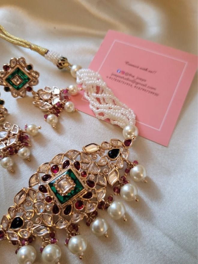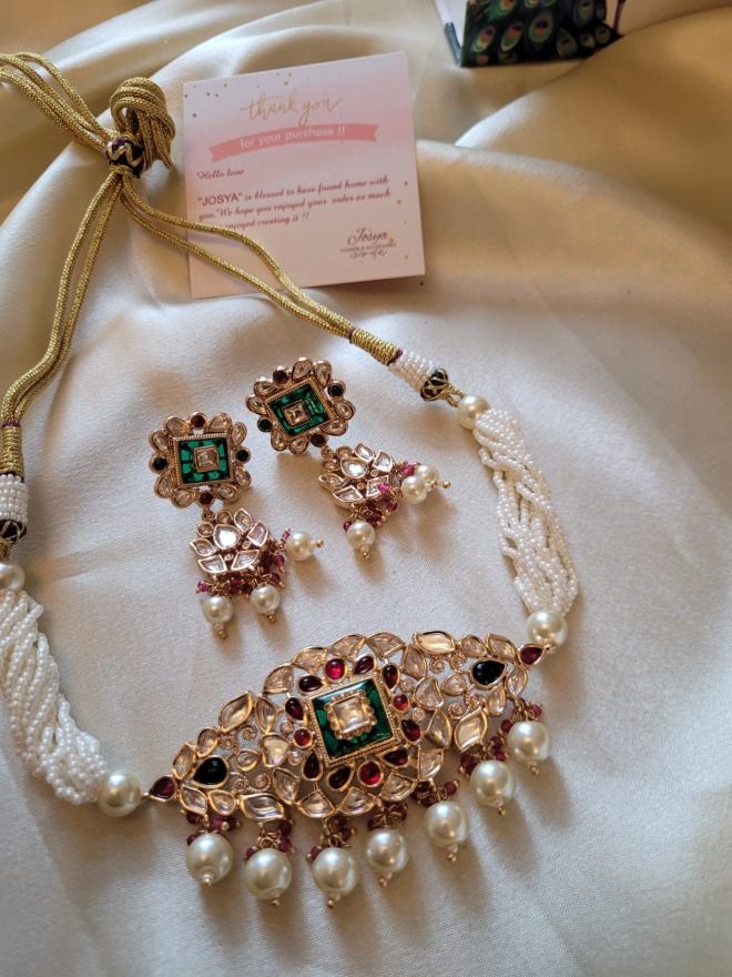 A stunning minimal Polki choker set, gold-plated and adorned with multi colour semi precious stones. This elegant piece features pink and green colored stones, complemented by emerald beads and pearl bunches at the bottom. The set includes matching floral earrings and a maangtikka, completing the ensemble with grace.