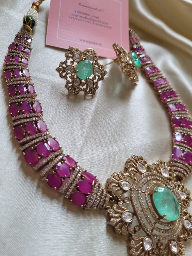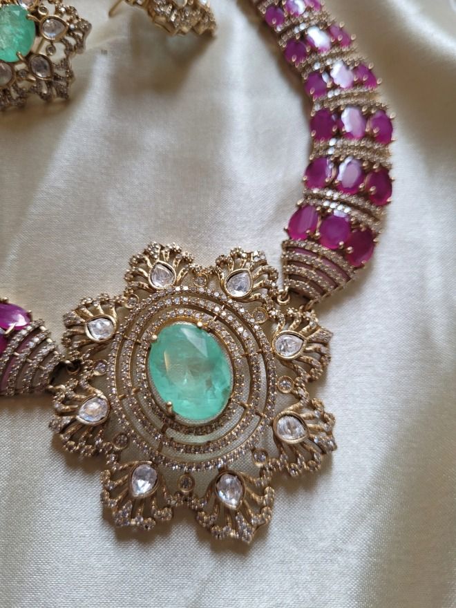 Indulge in the opulence of this stunning necklace set, featuring a mesmerizing blend of vibrant semi-precious ruby pink stones. The intricate design showcases a central floral motif adorned with a magnificent semi-precious turquoise doublet at the center of the pendant, perfectly complemented by matching stud earrings, all surrounded by a halo of sparkling rubies. The necklace set is also studded with Moissanite Polki and CZ diamonds, adding to its luxurious charm.