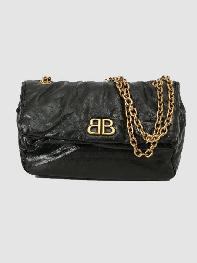 The bold yet minimalist design is enhanced by the iconic BB logo hardware on the front flap, adding a signature Balenciaga touch. A polished chain strap provides versatile wear — carry it as a chic shoulder bag or a stylish crossbody.