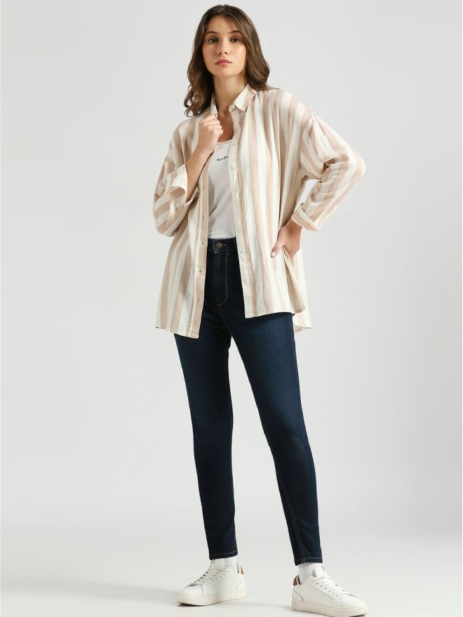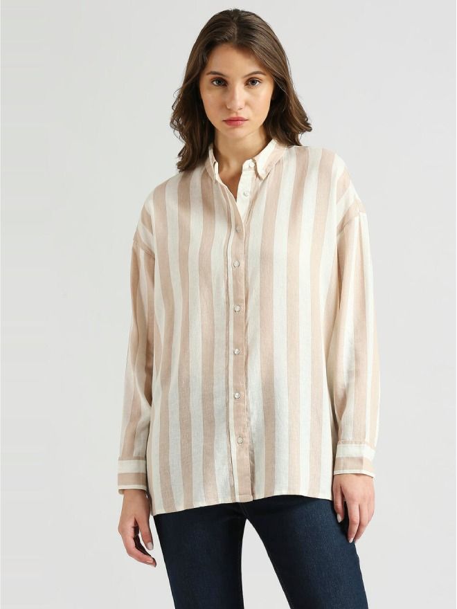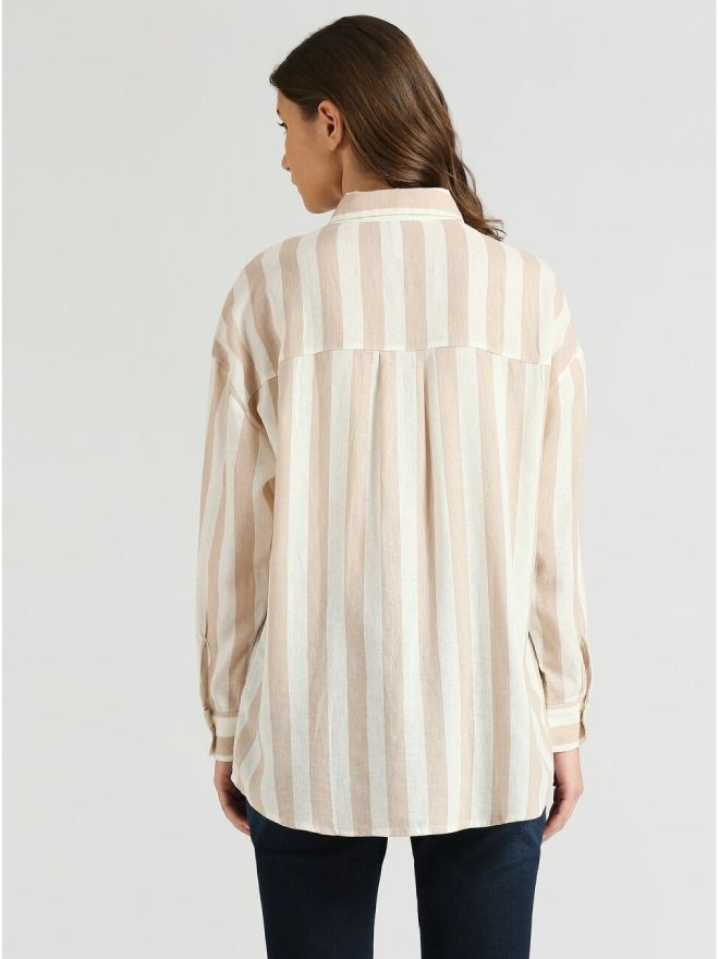 Breeze through the season in style with our effortlessly chic beige long sleeve shirt. Featuring a timeless stripe pattern, this shirt is crafted from a soft and breathable linen-viscose blend, offering all-day comfort in warm weather. The relaxed drop shoulder design and oversized fit bring a laid-back, modern edge to your look—perfect for beach days, brunches, or city strolls.