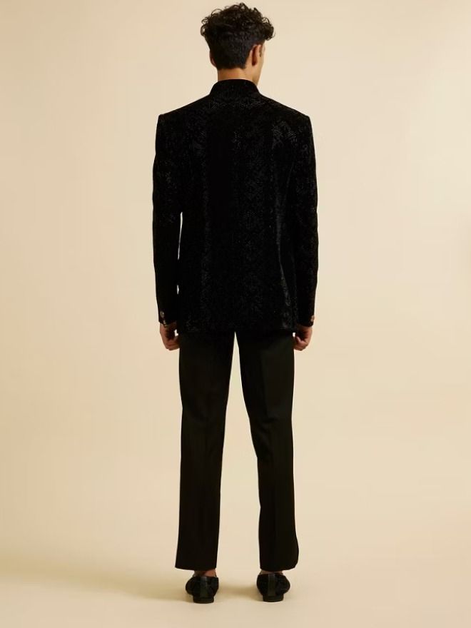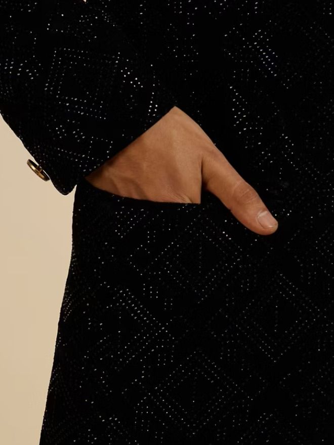 Showcasing exquisite rhinestone work in a diamond pattern, this black diamond patterned kurta set relays subtle luxury. The suit is further enhanced with an embroidered neckline, and golden buttons making it an ideal choice for formal occasions and celebrations where a sophisticated and dazzling appearance is desired. Style it with sleek gold jewellery and black sandals.