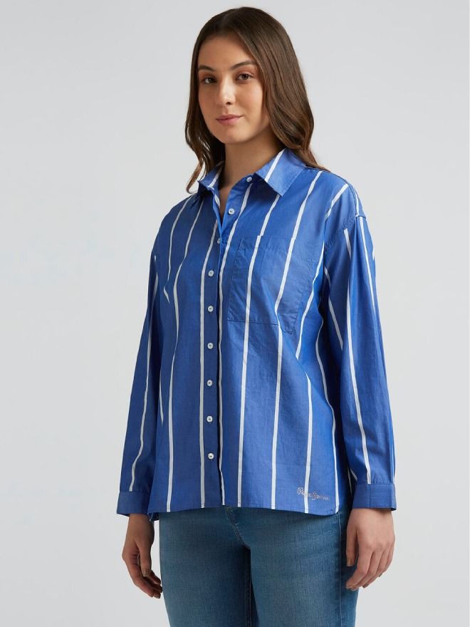 Refresh your wardrobe with this timeless and elegant blue striped shirt, designed for the modern woman who values both style and comfort. Made from breathable cotton and treated with a silicon softener wash, it delivers an ultra-soft, luxurious feel for all-day wear. The yarn-dyed stripes lend a classic yet eye-catching appeal, while rhinestone embellishments at the hem add a subtle touch of sparkle. Full sleeves make it ideal for year-round styling, and a functional patch pocket adds a hint of utility to its chic design.
