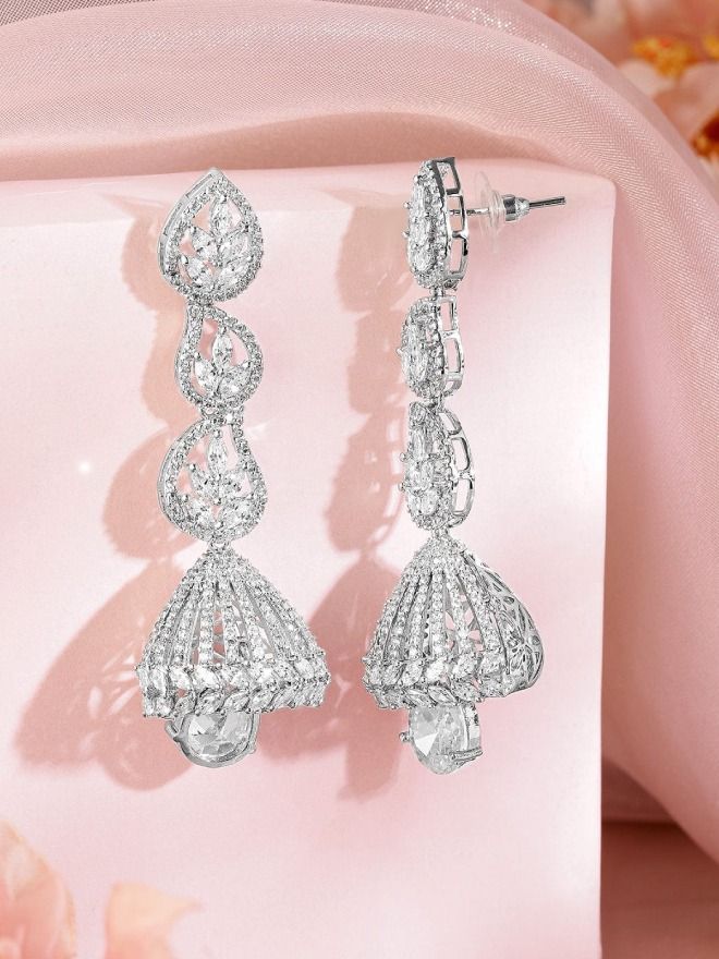 Earrings : These rhodium-plated statement earrings feature a dazzling array of cubic zirconia, designed in an elegant drop style, perfect for enhancing any look with sophistication and sparkle.
