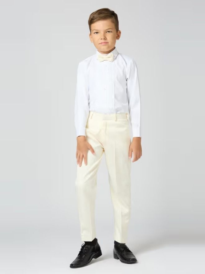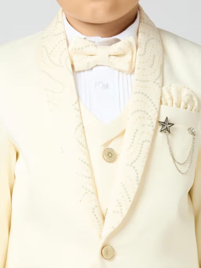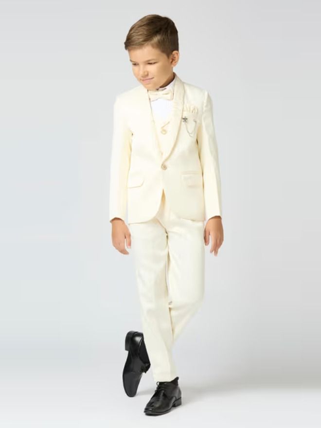 Exude Charm and Elegance with This Cream Suit Set for Boys, Featuring A Blazer with A Dazzling Sequin Collar. The 5-Piece Ensemble Includes A Blazer, Trousers, A Crisp Shirt, A Sophisticated Waistcoat, and A Matching Bow Tie, Making It Ideal for Weddings, Parties, and Festive Occasions. Crafted for Comfort and Refined Style.