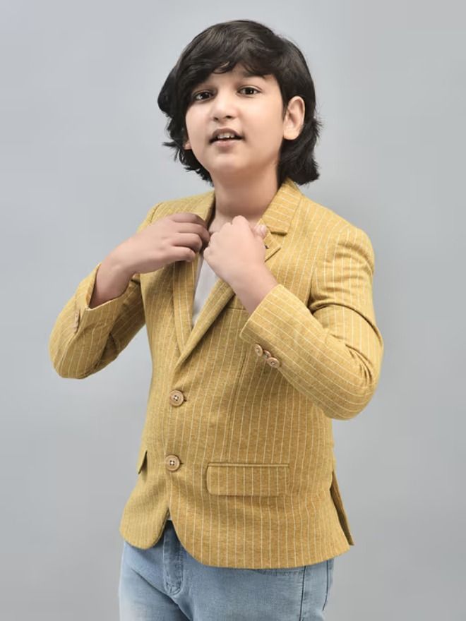 Revamp your little one's wardrobe with this mustard blazer from CRIMSOUNE CLUB. Crafted from blended fabric, it is finished with full sleeves and a notched lapel.