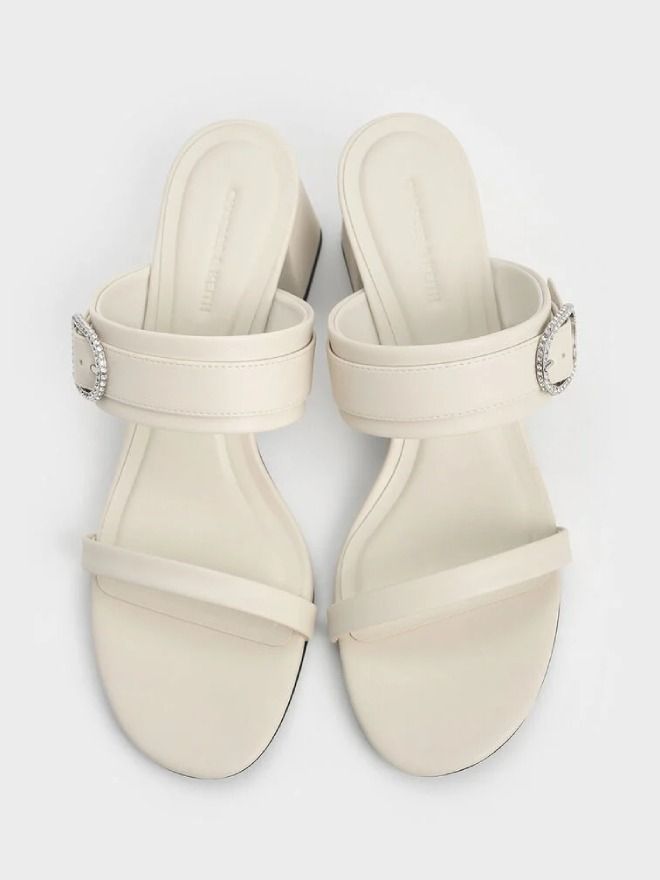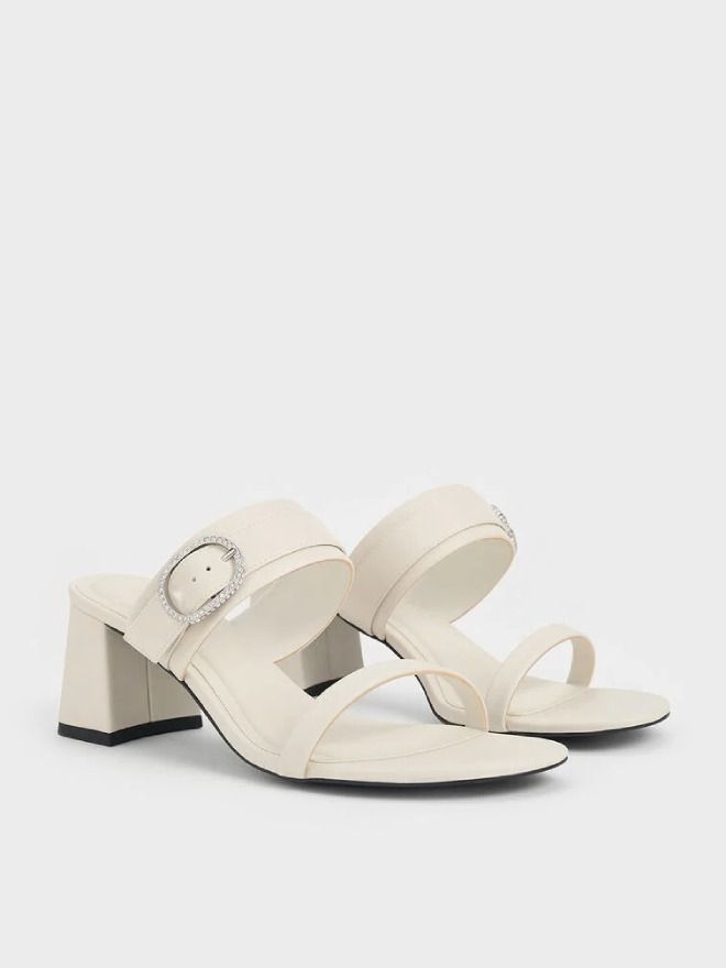Step into understated elegance with these chic chalk-white block-heel mules. Featuring distinctive oval-shaped buckles adorned with delicate crystal gems, they add just the right amount of sparkle to a minimalist silhouette. Thoughtfully designed with asymmetrical strap widths and subtly curved block heels, these mules bring dimension and visual interest to every step. The comfortable mid-height block heels offer a graceful lift, making them perfect for both everyday wear and dressier occasions.