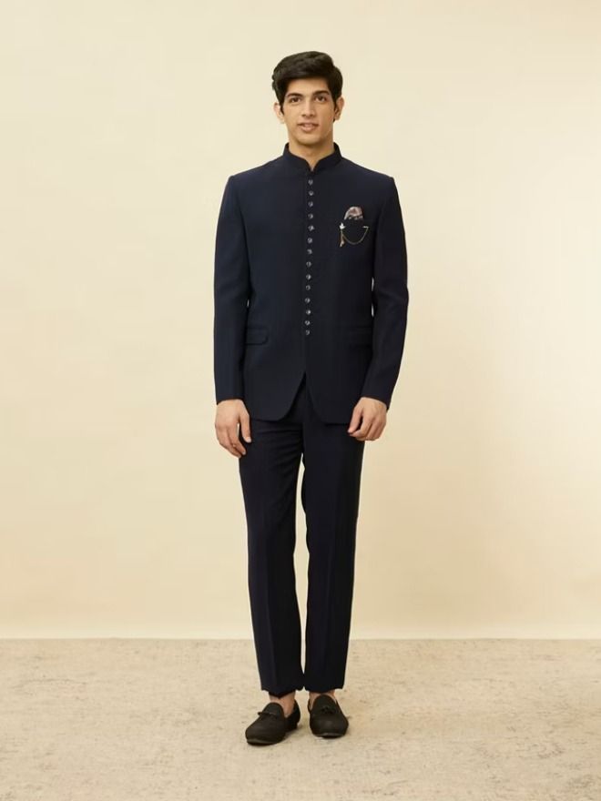 Elevate your formal wardrobe with our Dark Sapphire Blue Jodhpuri Suit, a seamless fusion of timeless Indian tradition and modern sophistication. This impeccably tailored ensemble features a classic bandhgala collar, regal emblem buttons, twin flap pockets, and a welted chest pocket—offering both style and functionality.