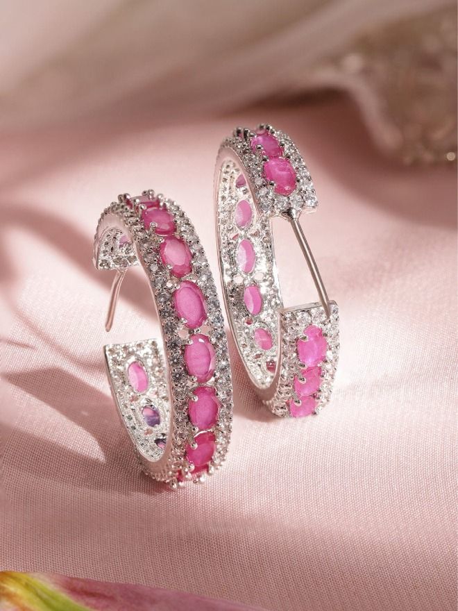 Immerse yourself in the opulence of these meticulously crafted earrings, featuring exquisite oval-cut Ruby Crystal Zirconia. The chic design, coupled with demi-fine detailing and the radiant allure of rhodium plating, makes these hoops a symbol of luxury and contemporary elegance. Adorn your ears with a touch of sophistication that effortlessly transitions from day to night, embodying the perfect blend of high-quality craftsmanship and refined style.