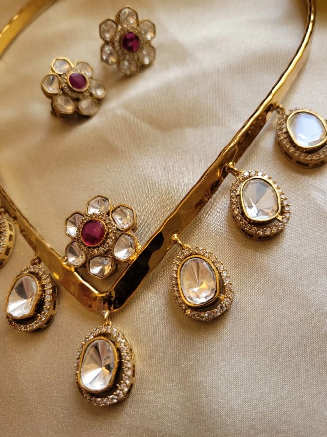 The Eesha Hasli Necklace Set is a timeless piece that effortlessly blends tradition with elegance. Inspired by classic South Indian jewelry, the Hasli design is known for its bold, structured form and intricate detailing, making it a standout choice for brides, festive occasions, or cultural celebrations.
